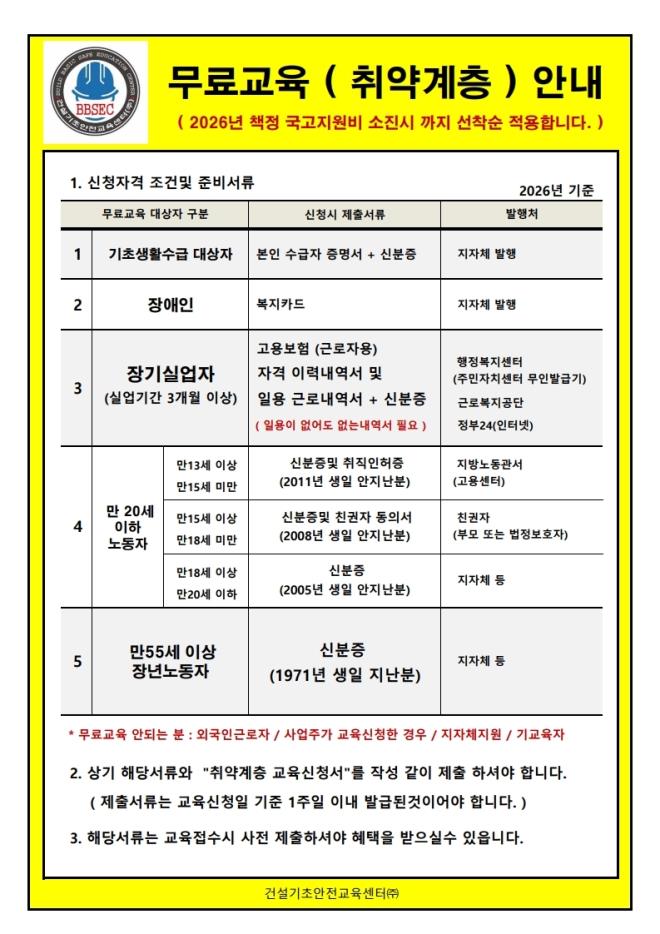 2026년 취약계층 무료교육 지원사업을 2026년 1월2일 부터 실시하오니 참고하시어 혜택 받으시길 바랍니다.